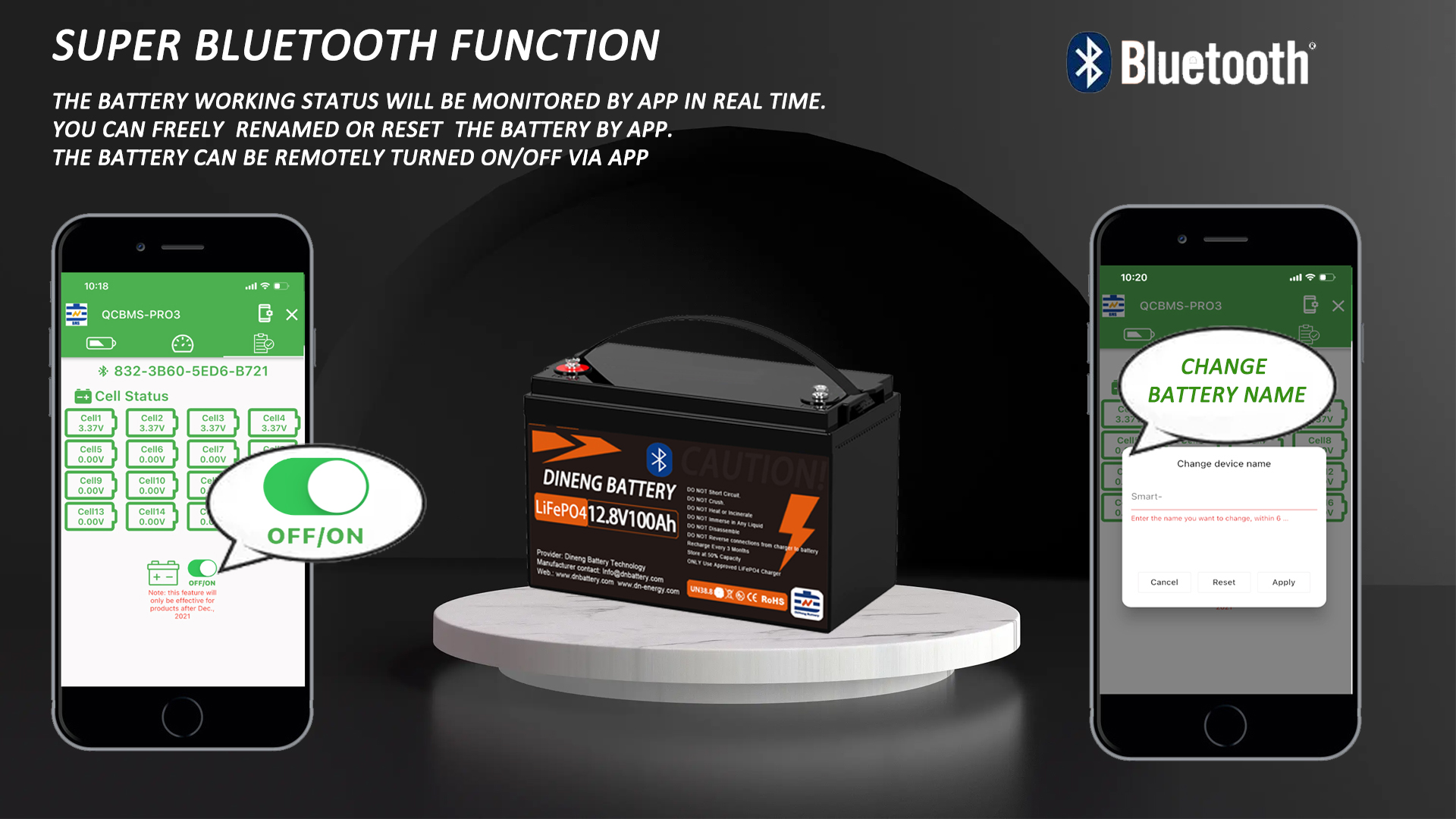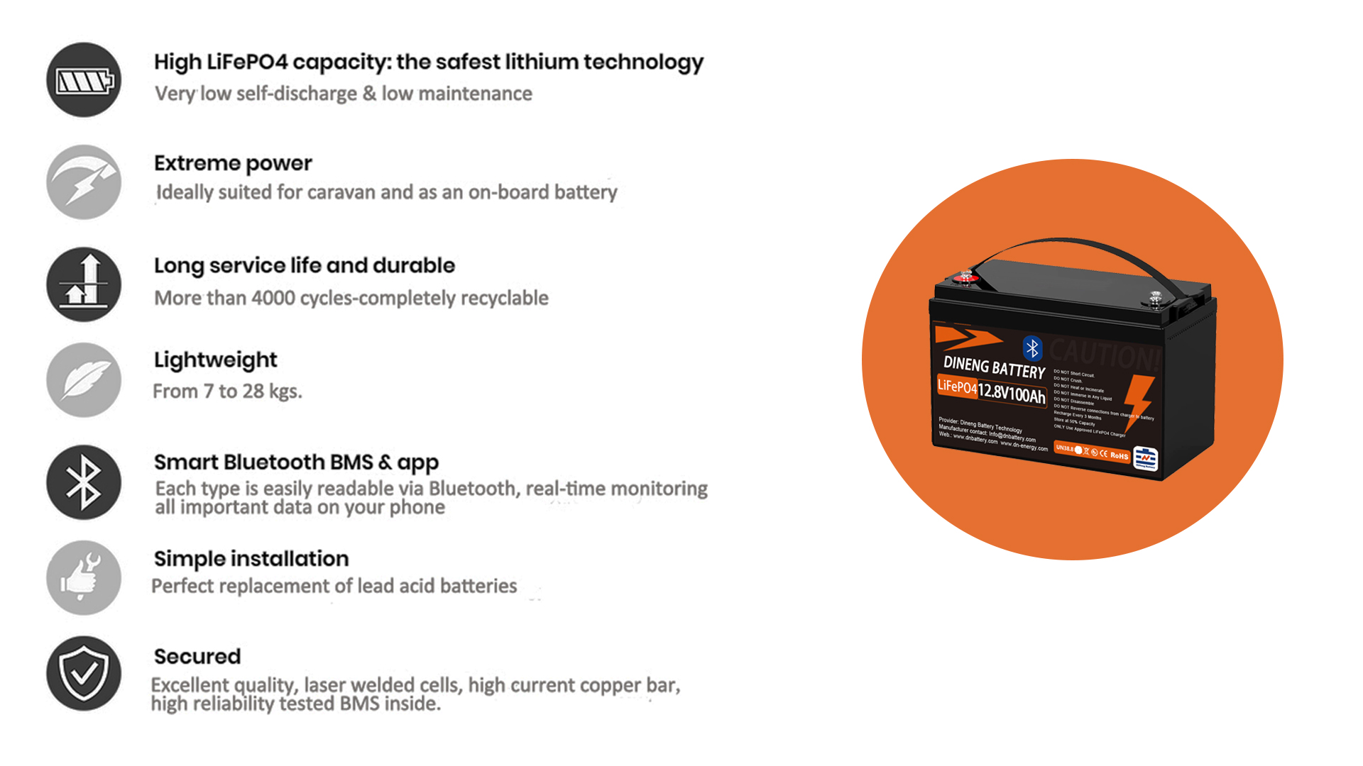 Dineng LiFePo4 Bluetooth batteries is ideal as a lightweight and long-lasting replacement for lead batteries (lead acid).
