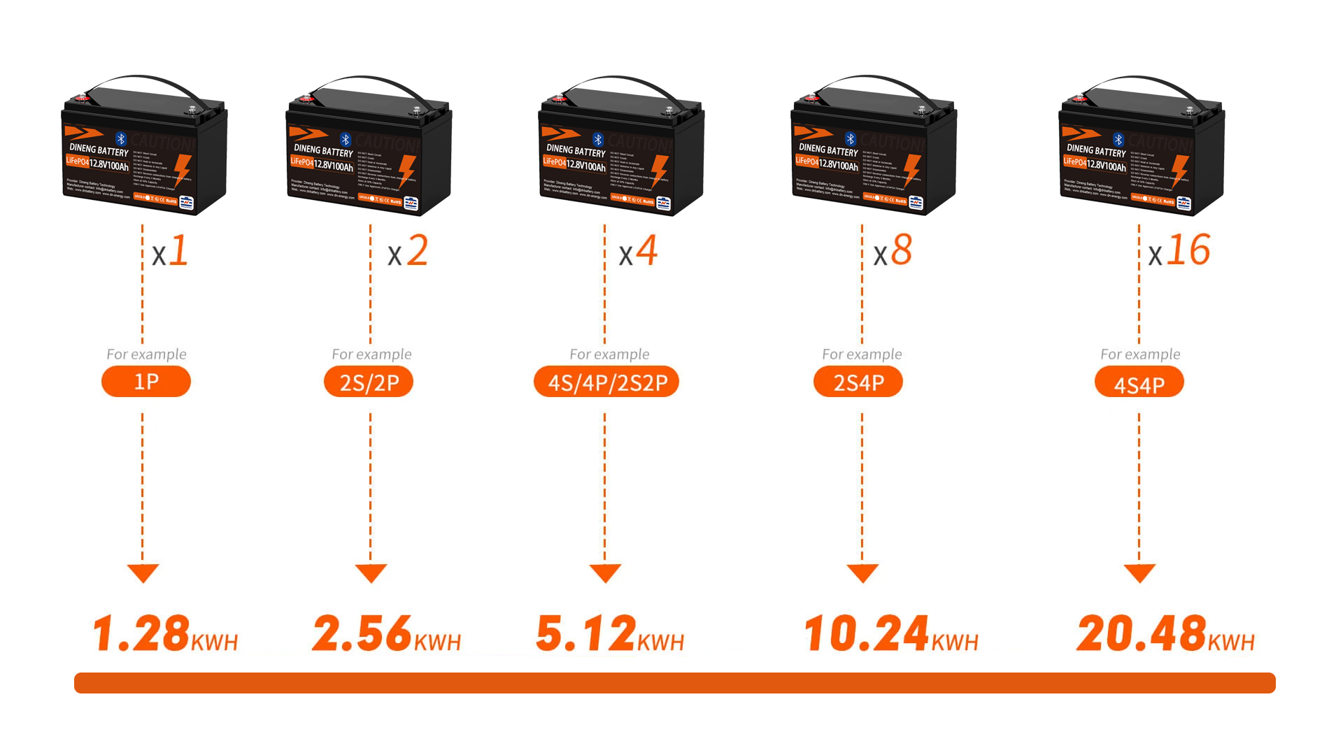 Dineng battery 12V 100Ah Lithium batteries support up to Max 4S4P connections to get more energy up to 20.48kWh.