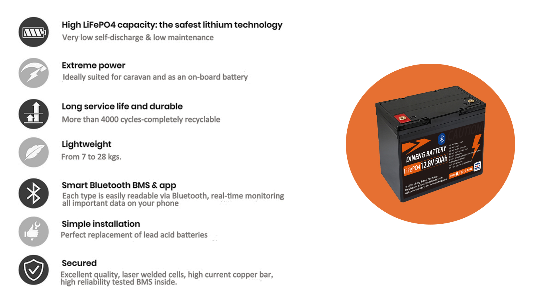 Dineng LiFePo4 batteries is ideal as a lightweight and long-lasting replacement for lead batteries (lead acid).